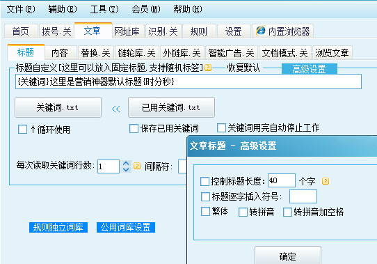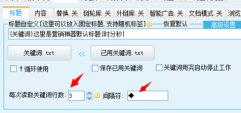 Q:文章标题是如何产生的? 答:首先需要设置【关键词.txt】,一行一个关键词,如: 减肥产品 减肥产品什么好 减肥产品哪里买 什么减肥产品好 标题自定义内填写标签{关键词}就可以每次调用一行关键词来生成文章了 生成前的设置:【推荐】2013{关键词}{随机数字=5} 生成后的标题:【推荐】2013减肥产品55629 Q:如何每次读取多行关键词? 答:设置每次读取关键词行数,也可以设置间隔符。
