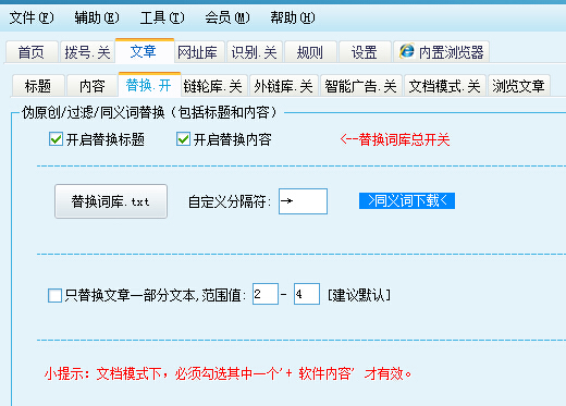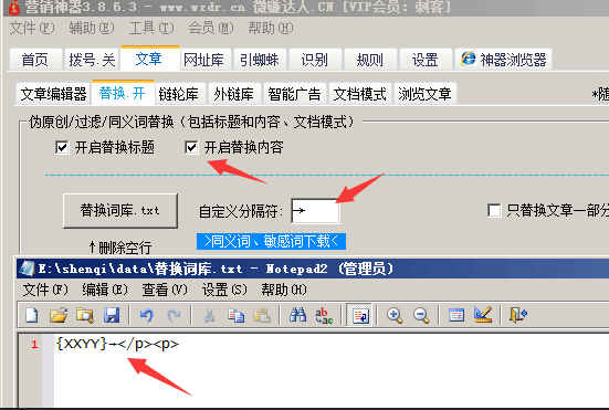 用途: 文章伪原创,或者替换一些违规词,神器会批量把文章 “→” 左边的文本,替换为右边的文本。 使用方法: 替换词库.txt放入同义词,然后勾选“开启替换标题”、“开启替换内容” “替换词库.txt”格式: 芙蓉姐姐→芙蓉妹妹 wang赚达人→营销神器 淘宝→天猫 如果标题、内容包含“芙蓉姐姐”,自动把这几个字替换为→后面的内容; 过滤违规词: 芙蓉姐姐→ “这里留空即可” wang赚达人→{换行符} 右边还支持换行符