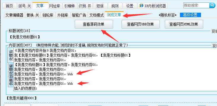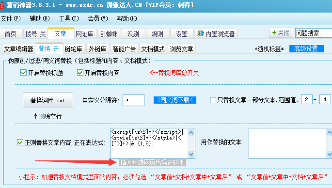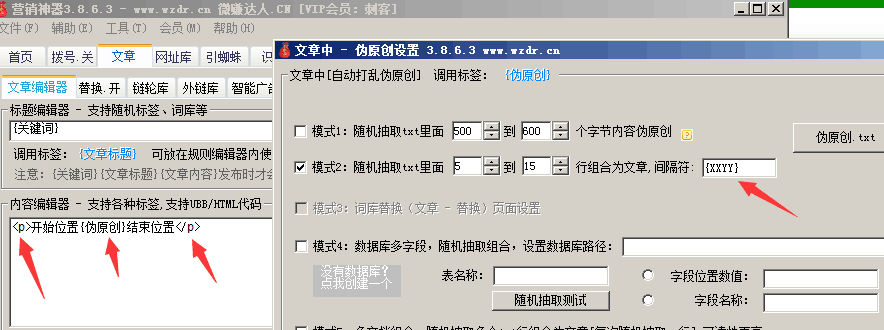 详细正则替换参考:http://www.wzdr.cn/article-568.html (正则18) 小提示:旧版文档模式下,必须勾选其中一个'+ 软件内容' 才有效。 Q、哪里有“同义词”、“敏感词”下载? 答:http://www.wzdr.cn/thread-44634-1-1.html Q、最常用汉字排行榜 答:http://www.wzdr.cn/article-798.html Q、旧版如何把伪原创中的换行符,替换为 标签?答:可以用“文章替换”功能解决。(如下图) 1. 设置伪原创间隔符为{XXYY},并在内容编辑器前后加入P标签和P闭合标签
