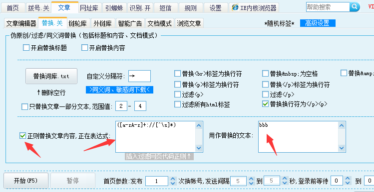 --6.1.70新增[@*文章替换]标签,可以在任何步骤替换替换文章编辑器“{文章内容}”调用的内容为刚刚获取到的相应参数。 例: [发布提交网址1]http://t.wzdr.cn[/发布提交网址1] [发布提交1参数1]>(.*?)<[/发布提交1参数1] --[发布提交1参数1替换]神器>>>【sq】[/发布提交1参数1替换] --[发布提交1文章替换]【测试1】>>>BBB{发布提交1参数1}[/发布提交1文章替换] --把【测试1】替换为BBB --此标签可以替换{文章内容}里面的数据,替换多个请用英文|隔开 [发布提交1文章替换]【测试1】>>>BBB|测试2>>>CCC[/发布提交1文章替换] --替换多个 [发布提交网址2]http://t.wzdr.cn/?{文章内容}[/发布提交网址2] Q、如何在我的文档中,自动插入关键词超链接? 答:替换词库设置里面设置好相应的 关键词+超链接代码 。 [2016-05-31更新] [2016-12-09更新] [2017-04-04更新] [2017-09-21更新] [2018-11-20更新] [2019-04-26更新] [2021-11-19更新] |