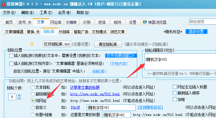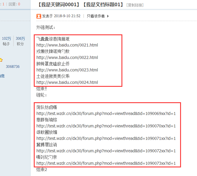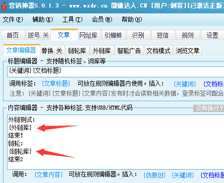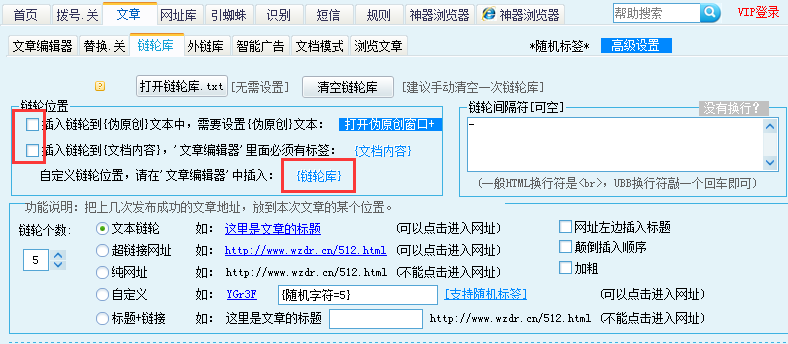 Q:为什么第一篇文章没有链轮? 答:由于第一篇文章发布之前,是没有任何网址的,所以第二篇文章开始,才会在指定位置插入N个链轮网址。 Q:链轮有哪些格式? 答: 1.文本链接,如: 这里是关键词内容 (可以点击进入网址) 2. 超链接网址,如: http://www.wzdr.cn/512.html (可以点击进入网址) 3. 纯网址,如: http://www.wzdr.cn/512.html (不能点击进入网址) 4. 一些特殊组合效果如下图
