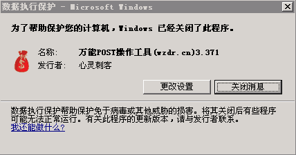 神器支持:WIN10/WIN8.1/WIN8/WIN7/2012/2008/2003/XP,系统可能因设置不当(安全级别过高),而出现打不开软件的情况。(正常情况,32位/64位Win系统都能运行神器的) 症状: 1、打开就立即被关闭 (如下图) 2、只显示神器载入进度条 3、打开就立即报错 4、提示“数据执行保护”(如下图)