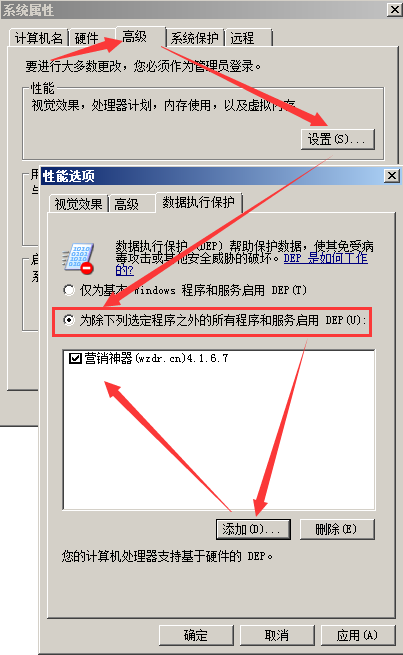 解决方法2: 数据执行保护 - 添加 '营销神器.exe' - 确定