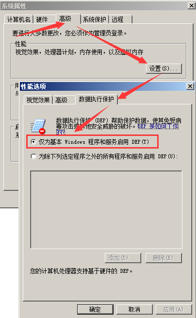 解决方法1: 我的电脑 - 右键设置 - 系统属性 - 高级 - 性能设置 - 数据执行保护 - 勾选“只为关键 Windows 程序和服务启用数据执行保护 ”