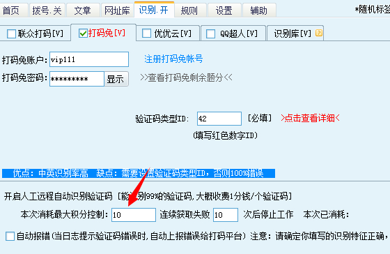 如果设置为10,就表示消耗了10个打码积分后,立即停止工作,如图: