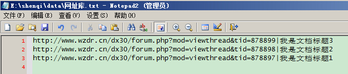 但我们这次说的是把网址和文档标题,一一对应保存到网址库里面,参考例程: Q:新版: [网址库]{文章标题}|{成功网址}后面可以是其他要保存的数据标签[/网址库] Q:太旧的版本由于网址库标签不支持{文章标题},所以可以这样: [发布提交网址1]http://www.wzdr.cn/dx30/forum.php?mod=post&action=newthread&fid=2&extra=&topicsubmit=yes[/发布提交网址1] [发布提交数据1]formhash={登录后提交1参数1}&posttime=1388901041&wysiwyg=1&subject={文章标题}&message={文章内容}&allownoticeauthor=1&usesig=1&save=[/发布提交数据1] [发布成功特征1]>发表于 <===发布成功了哦。。。[/发布成功特征1] --------------------------------------------------------------------------------获取发布提交网址1返回的参数 [发布提交1参数1]< link href="http://www.wzdr.cn/dx30/forum.php\?mod=viewthread&tid=(.*?)"[/发布提交1参数1] --获取成功帖子ID [发布提交1参数2] [网址库]http://www.wzdr.cn/dx30/forum.php?mod=viewthread&tid={发布提交1参数1}|{发布提交1参数2}[/网址库] --组合成最终需要保存的网址 --注意,如果|后面保存的中文标题是乱码,那么,需要加一个解码标签{utf8解码:{发布提交1参数2}} |