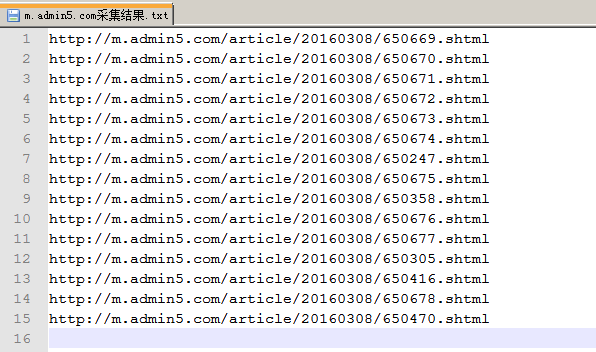 {循环递增数字=1,3,1} --标签表示采集1-3页,每次递增1。详细解释,请在规则编辑器里面点击相应标签。 例: [发布1返回编码]utf8[/发布1返回编码] --页面编码返回,本规则可删除 [发布提交网址1]http://m.admin5.com/getmore/0/1/{循环递增数字=1,3,1}?flag_id=650693[/发布提交网址1] [发布提交1参数1]article/(.*?)/[/发布提交1参数1] --参数标签只会保存第一个匹配结果,本规则可删除 [发布提交1采集1]<#li><#a href="(.*?)">[/发布提交1采集1] --采集标签可以保存所有匹配结果 (请去掉左边的2个#号再执行规则) [发布提交1采集1顺序]0[/发布提交1采集1顺序] --可以不用此标签,0=顶部结果放到顶部,1=顶部结果放到尾部。如果没有顺序标签,默认为0 [发布成功特征1]>===页面正常打开![/发布成功特征1] --成功了才会保存,新版也可以不用成功标签 [发布成功保存1]c:\m.admin5.com采集结果.txt==={发布提交1采集1}[/发布成功保存1] --保存相应结果到指定位置