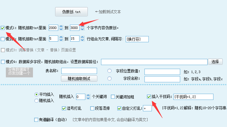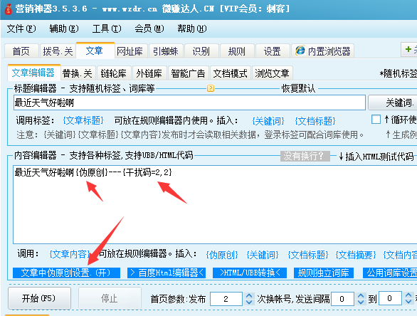 标签:{干扰码=1,2} --共2个参数,“1,2”表示随机生成10-20个字符的字符串。 Q、和Discuz!干扰码的区别是什么? 答:Discuz!干扰码,加入了白色背景(用的<#span style="display:none"><#/span>属性隐藏),营销神器的干扰码暂时不能自定义颜色。 Q、加入干扰码有什么好处和坏处? 答:理论上是违反了搜索引擎的规定,是不推荐的。但是他也可以当作是“原创文本”,被搜索引擎喜欢。(搜索引擎毕竟是机器,bug依旧太多。) 开启方法: 1.文章 - 文章编辑器 - 文章中伪原创设置 |