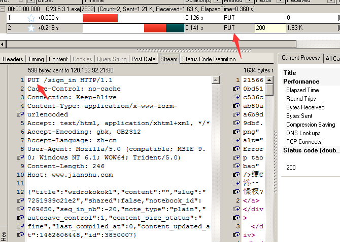 例2: [登录协议头1]方法: PUT[/登录协议头1] [登录提交网址1]http://www.jianshu.com/writer/notes/4102362[/登录提交网址1] [登录提交数据1]{"title":"wzdrokokok1","content":"","slug":"7251939c21e2","shared":false,"notebook_id":769650,"seq_in_nb":-20,"note_type":"plain","autosave_control":1,"content_size_status":"fine","last_compiled_at":0,"content_updated_at":1462606448,"id":3850007}[/登录提交数据1]
