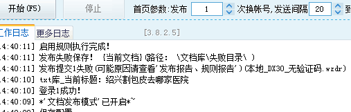 | Q、哪些情况会发布失败? 答:当内容不符合发布要求可能有以下情况。 1、文章标题内容太长 2、文档标题内容太长 3、文档标题内容太短 4、某个文章关键词违规 5、某个文档关键词违规 等. 当出现上面情况时,程序并不知道是什么原因,如果不强行跳过文章(或关键词),会造成一直失败。 Q、如何知道哪些文章被跳过了? 答: [发布失败保存1]发布失败的标题.txt==={文章标题}[/发布失败保存1] Q、如何知道哪些文档被跳过了? 答: [发布失败保存1]{当前文档}[/发布失败保存1] --保存在目录“\文档库\失败目录”中 [3.8.2.5以上版本支持] --所以:[发布成功保存1]{当前文档}[/发布成功保存1] --保存在目录“\文档库\成功目录”中