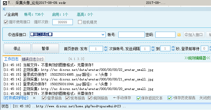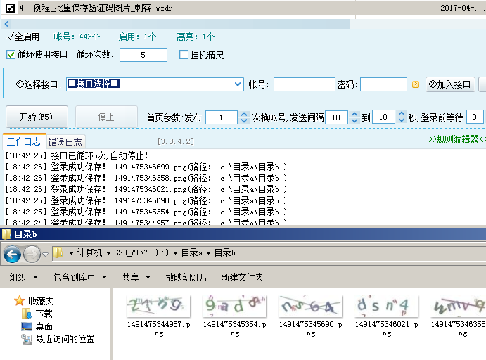 例1: [登录提交网址1]https://passport.sohu.com/apiv2/picture_captcha?userid=13166753574&time=0.204894320061992[/登录提交网址1] [登录成功保存1]c:\目录a\目录b==={时间戳}.png[/登录成功保存1] --当左边是目录格式,右边含有.后缀时,自动以文件方式保存 如下图: 例2:(采集论坛头像) --这个只是例程,所以用循环标签来模拟采集好的用户uid,正式采集时,建议先手动采集好存在的uid [登录提交网址1]http://www.discuz.net/home.php?mod=space&uid={循环递增数字=1,20000,1}[/登录提交网址1] --获取用户页面返回的头像地址 [登录提交1参数1]<#div class="icn avt"><#a href=".*?"><#img src="(.*?)"[/登录提交1参数1] --请自己删掉左边的3个#号 --这样就可以提示正在采集的头像地址,也可以不提示 [登录成功特征1]===正则采集:{登录提交1参数1}[/登录成功特征1] --访问头像地址 [登录提交网址2]{登录提交1参数1}[/登录提交网址2] --如果头像存在,就会自动保存到相应目录 [登录成功保存2]c:\头像==={时间戳}.jpg[/登录成功保存2] --采集时,勾选“循环使用接口”,“登录前等待”时间设置为0秒