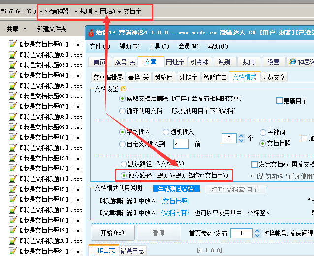 如果我们希望每个网站,发布不同类型的文章 需要在“文档模式”页面勾选“独立路径” 那么: “规则\网站1\文档库\”存放减肥文章 “规则\网站2\文档库\”存放护肤文章 “规则\网站3\文档库\”存放眼镜文章 ...