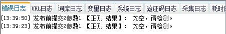 当我们规则出现问题的时候,我们第一时间就是查看错误日志。 分析上面截图: 1、可能[发布前提交网址2]返回的数据异常 (如果之前正常,突然这样,可能是网站改版了) 2、可能[发布前提交2参数1]正则表达式错误 解决: 1、打开规则报告,查看[发布前提交网址2]返回的文本 2、工具菜单 - 正则调试工具 |