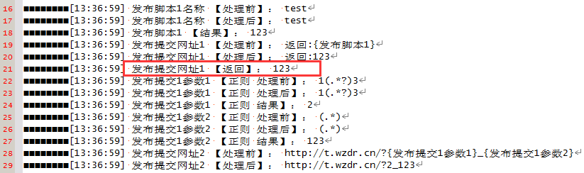 例1: [登录提交网址1]返回:{变量1}[/登录提交网址1] --返回相关变量标签解析后的文本 [发布提交网址1]返回:{文档标题}[/发布提交网址1] --返回文档标题,然后用参数标签来正则提取(注意,{文档标题},只能在发布标签中首次触发) [发布提交网址1]返回:{文档内容}[/发布提交网址1] --返回文档内容,然后用参数标签来正则提取(注意,{文档内容},只能在发布标签中首次触发) 例2: [登录提交网址1]返回:"name":"token","controlType":"Hidden","value":"660f72236a5e999"[/登录提交网址1] --返回指定的文本,通常是测试参数获取 例3: [发布脚本1]function test() { return "123"; }[/发布脚本1] [发布脚本1名称]test[/发布脚本1名称] [发布脚本1参数][/发布脚本1参数] [发布提交网址1]返回:{发布脚本1}[/发布提交网址1] [发布提交1参数1]1(.*?)3[/发布提交1参数1] [发布提交1参数2](.*)[/发布提交1参数2] [发布提交网址2]http://t.wzdr.cn/?{发布提交1参数1}_{发布提交1参数2}[/发布提交网址2] 规则报告: