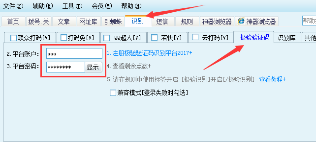 例: [编码]utf8[/编码] --获取螺丝帽识别需要的key值 [登录前提交网址1]https://captcha.luosimao.com/demo/[/登录前提交网址1] [登录前提交1参数1]data-site-key="(.*?)"[/登录前提交1参数1] --螺丝帽验证需要传递key值 [登录1螺丝帽识别]{登录前提交1参数1}[/登录1螺丝帽识别] --返回的resp值用{登录1螺丝帽识别}调用 --带上返回的resp值提交登录 [登录提交网址1]https://captcha.luosimao.com/demo/submit[/登录提交网址1] [登录提交数据1]luotest_response={登录1螺丝帽识别}[/登录提交数据1] [登录成功特征1]success===登录成功![/登录成功特征1] --需要4.3.5.5 以上版本支持。 Q、螺丝帽验证码识别平台帐号怎么注册?哪里登录充值? 答:http://jiyan.c2567.com/index.php/login/index.html (不能用中文帐号注册) Q、极验识别价格是多少? 答:识别成功扣1点,不成功不扣点。(2分钱1点,具体价格以官方充值时显示的价格为准,活动期间价格更低) Q、营销神器哪里输入平台账号密码? 答:和极验识别一样。(如下图)