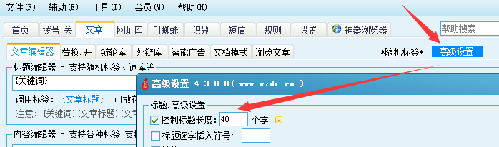 上面是网站不允许标题超过80个字符(40)个汉字的长度。 Q、遇到这种问题如何解决? 答:手动删除一些长标题的关键词,或者 文章 - 高级设置 - 控制标题长度 (会自动删除标题后面多余的文本,如下图)