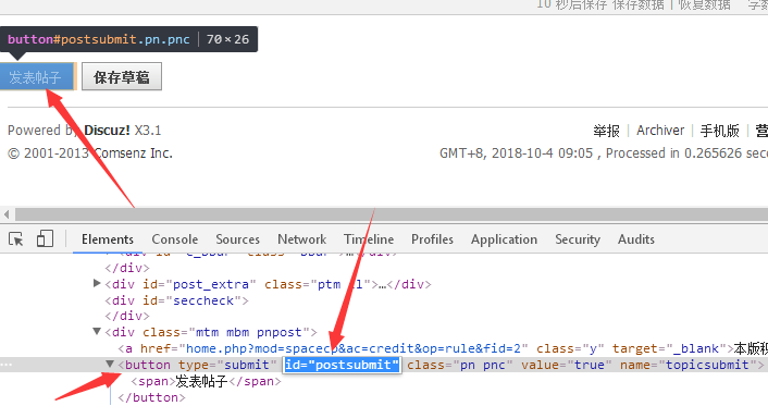 ----------------------------------------------------------------------------------------------------------------------------------------------------------------------------------------------- 右键点击标题发布按钮,检查,找到唯一元素,如:name="topicsubmit" (如下图) [发布1等待]200[/发布1等待] --等待200毫秒 [发布1点击][name="topicsubmit"][/发布1点击] --发帖按钮点击 【详细说明】 --[发布1鼠标单击][name="topicsubmit"],10,10[/发布1鼠标单击] --也可以用鼠标单击,第一个参数为选择器,后面2个是坐标偏移值(像素),因为元素坐标是按钮左上角
