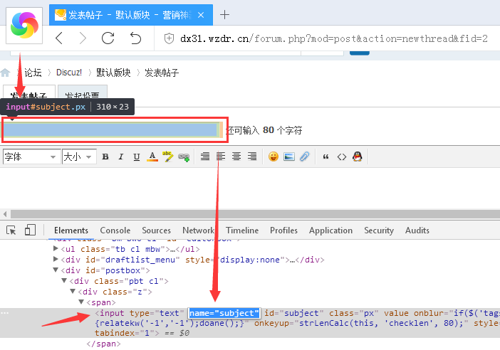 ----------------------------------------------------------------------------------------------------------------------------------------------------------------------------------------------- 右键点击标题文本框,检查,找到唯一元素,如:name="subject" 或 id="subject"(如下图) [发布1打开]http://dx31.wzdr.cn/forum.php?mod=post&action=newthread&fid=36[/发布1打开] --打开发帖页面 【详细说明】 [发布1就绪判断][name="subject"][/发布1就绪判断] --检测是否打开完毕 【详细说明】 [发布1等待]200[/发布1等待] --等待200毫秒 [发布1写内容][name="subject"],"{文章标题}"[/发布1写内容] --填写文章标题 【详细说明】