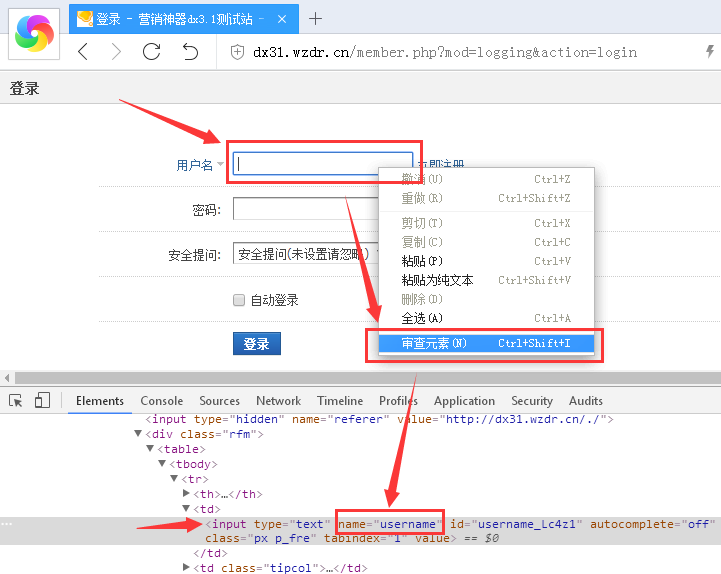 ----------------------------------------------------------------------------------------------------------------------------------------------------------------------------------------------- 右键点击密码文本框,审查元素,找到唯一元素,如:name="password"(如下图) [登录1写内容][name="password"],"wzdrwzdr"[/登录1写内容] --填写密码wzdrwzdr 【详细说明】
