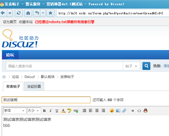 ----------------------------------------------------------------------------------------------------------------------------------------------------------------------------------------------- 填写标题和内容后,如下图: ----------------------------------------------------------------------------------------------------------------------------------------------------------------------------------------------- 发布成功后,会跳转到帖子页面,此页面找一个成功特征关键词,如“发表于”。(如下图) [发布1填表成功特征]发表于===填表。。发布成功了[/发布1填表成功特征] --判断是否成功 【详细说明】 [发布1填表失败特征]抱歉,您尚未输入标题或内容===抱歉,您尚未输入标题或内容[/发布1填表失败特征] --没验证码的情况下,失败特征也可以不填写 【详细说明】 ----------------------------------------------------------------------------------------------------------------------------------------------------------------------------------------------- 最后获取浏览器页面的网址,如上图。 [发布1取网址]http://dx31.wzdr.cn/forum.php?mod=viewthread&tid=[/发布1取网址] --成功网址,必须包含这部分url 【详细说明】 [网址库]{发布1取网址}[/网址库] --保存网址 ----------------------------------------------------------------------------------------------------------------------------------------------------------------------------------------------- Q、上面是发布文章到默认的可视界面中,并不能发代码,应该如何发ubb代码呢? 答: [1.点击高级按钮] [2021-07-22更新] [2021-08-30更新] |