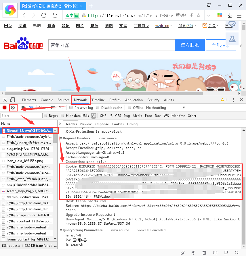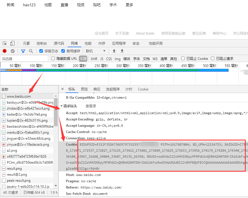 提示:部分新版chrome的cookie已被加密,建议用其他旧版试试。2021-05-22 另外可能QQ浏览器获取的cookie也不行。2021-06-19 360极速浏览器中,按键盘F12打开【开发者工具】界面 1、点击【Netword】进入网络抓包页面 2、打开网站并登录,在网页为登录状态的情况下,点击左边红色圆圈后面的【清除】图形,清空刚刚抓包的数据(如下图,第2个箭头位置) 3、这时候网页F5刷新一下页面,那么第一个被抓取到的网址,就是我们需要的(如下图,第3个箭头位置) 4、点击相应网址,右边就会显示出Cookie等很多信息,我们需要的就是Cookie: 后面的内容。(如下图,第4个箭头位置)