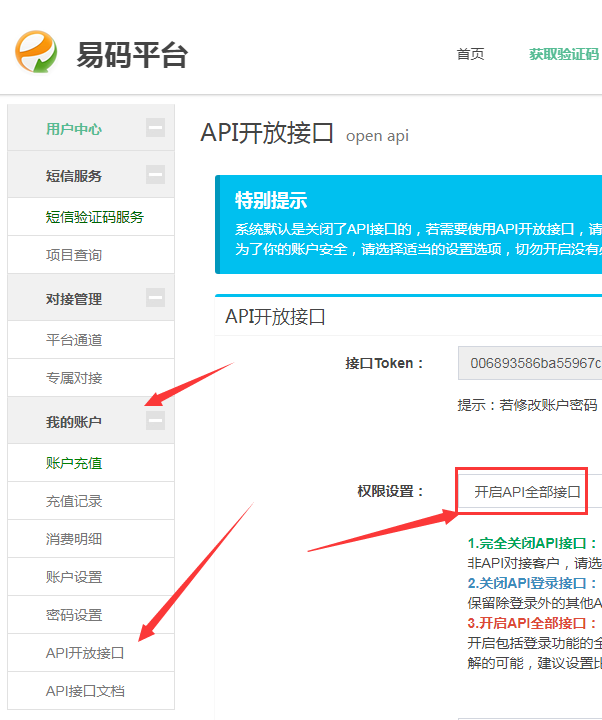 解决方法: 登录易码后台,权限设置为“开启API全部接口”,如下图: