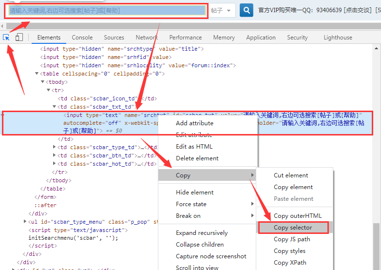 动画演示: 步骤: 1、打开相应网页,按F12打开开发者工具; 2、点击左上角“小箭头”按钮,松开鼠标,把鼠标移动到相应元素上(比如上面的文本搜索框),松开鼠标; 3、下面就会显示出当前元素的代码,在代码上右键,Copy - Copy selector, 得到css选择器:#scbar_txt 这个#号代码id,就是上面id="scbar_txt"的一种简写方式,如果这个选择器无法正确找到元素,还可以使用其他的, 比如:[name="srchtxt"] 如果有class="stxt",还可以使用 .stxt 点代表class简写方式,也可以这样写:[class="stxt"] 【方法2】 谷歌chrome浏览器F12-检查:(不推荐) ![]() 动画演示: 如上图,在相应元素上,点击右键“检查”找到相应元素代码区,在元素代码区,点击右键菜单 Copy - Copy selector 复制后,得到如下选择器代码: #wd 有些元素层数比较深,就会得到下面选择器代码: body > div:nth-child(15) > div.ivu-modal-wrap > div > div > div.ivu-modal-body > div.model-input > input 例1: [登录1打开]https://www.baidu.com/[/登录1打开] --打开百度 [登录1就绪判断]#kw[/登录1就绪判断] [登录1写内容]#kw,"aaa"[/登录1写内容] --写入内容 例2: [登录1点击]#two[/登录1点击] --点击按钮 例3: [发布1点击]body > div:nth-child(1) > div.bbs > div.wp.clearfix > div.left > div.adv > div.sub > a[/发布1点击] --点击a标签文字 例4: [发布1点击]body > div:nth-child(18) > div.ivu-modal-wrap > div > div > div.ivu-modal-body > div > div:nth-child(1) > img[/发布1点击] --点击图片 例5: [发布1写内容]body > div:nth-child(15) > div.ivu-modal-wrap > div > div > div.ivu-modal-body > div.model-input > input,"内容a"[/发布1写内容] 例6: [发布1选择]#three,cc[/发布1选择] --选择value为cc的选项 例7: [发布1点击]body > div.ivu-modal-wrap [text="设置"][/发布1点击] --点击“设置”按钮 例8: [发布1点击][text="设置"][/发布1点击] --点击“设置”按钮,也可以不填里面的2个引号 例9: