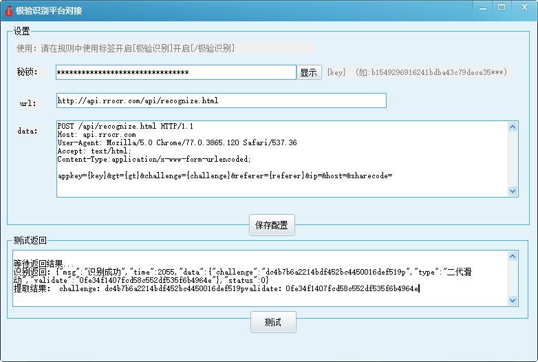需要自己对接极验识别打码接口,下面以人人为例: 由于此页面代码错误,请点击上面下载说明。 最后点击“保存配置”,然后“测试”即可。 规则中使用方法: 使用神器6.0.67以上版本; 填写好秘锁,然后调用标签 [极验识别]开启[/极验识别],其他方法和微凉c2567、滴滴极验识别相同。 |
