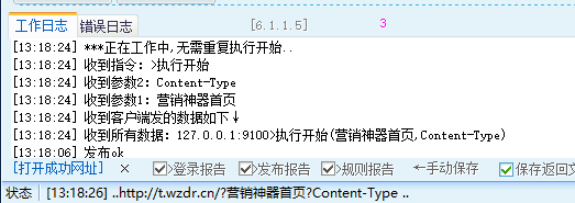 接口格式: 127.0.0.1:9100>执行开始(参数1,参数2,参数3) --多个参数用英文逗号隔开,最多支持接收20个参数 [发布成功特征1]127.0.0.1:9100>执行开始({发布提交1参数1},{发布提交1参数2}) [/发布成功特征1] --可以规则标签获取参数 --只要服务端收到发送的内容中包含关键词 >执行开始 就会执行开始 --如:127.0.0.1为本机IP,可以本机复制目录多开后,客户端营销神器 控制 服务端营销神器 --如:192.168.1.3为内网IP,可以在局域网其他电脑中,控制服务端上神器的工作和停止 --如:220.11.55.xx为公网IP,可以在本机发起请求到服务器,控制服务器上神器的工作和停止 Q、可以同时控制多台电脑吗? 答:可以,只需要增加下一组标签,如下 [发布提交网址2]返回:[/发布提交网址2] --可以直接返回空,或随便输入一个网址或本地txt都行 [发布成功特征2]127.0.0.2:9100>执行开始(参数1,参数2,参数3) [/发布成功特征2] --可以规则标签获取参数 注意: 如果你想把本地电脑作为服务端,可能需要路由器映射端口,相关资料查询百度 也就是说,客户端发请求给服务端,必须在客户端电脑上能正常ping通服务端电脑ip。 [2021-09-23更新] [2021-09-27更新] |